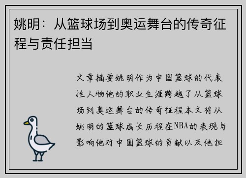 姚明,作为中国篮球的代表性人物,他的职业生涯跨越了从篮球场到奥运舞台的传奇征程。本文将从姚明的篮球成长历程、在NBA的表现与影响、他对中国篮球的贡献,以及他担任篮球管理职务后所承担的责任与挑战四个方面,全面解读姚明的传奇历程。姚明从早期的篮球训练到成为NBA全明星,再到担任中国篮球协会主席,始终肩负着引领中国篮球发展的重任。尤其是在他担任篮球协会主席后,如何推动中国篮球改革,改写中国篮球的未来,成为了他的又一重大使命。姚明不仅是一位球员,还是中国体育走向世界舞台的重要桥梁。